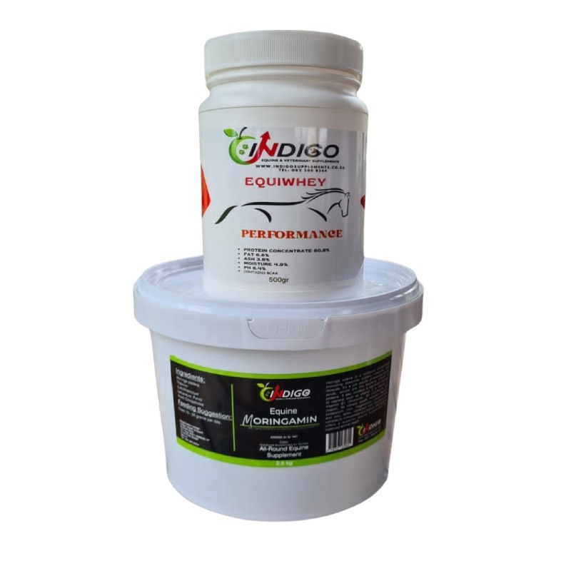 Moringamin (2.5kg) delivers Moringa Oleifera, antioxidants, and essential nutrients to nourish the gut, reduce inflammation, and improve nutrient absorption. Equiwhey (500g) provides high-quality whey protein to power muscle recovery, development, and conditioning—perfect for performance and growing horses.